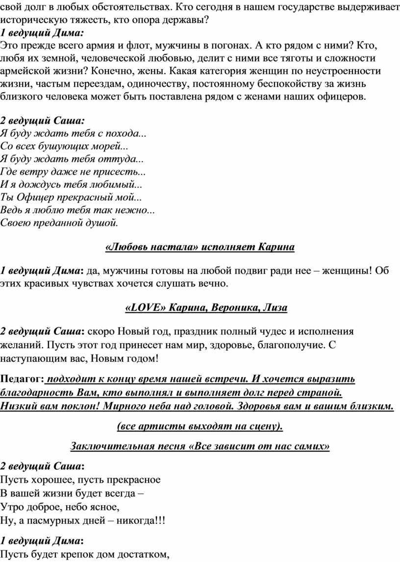 2 ведущий- Саша: сегодня мы – лицеисты, имеем счастливую возможность сказать Вам, уважаемые офицеры и воины срочной службы, самые добрые слова и порадовать знаками внимания. В мирной жизни и вы могли отжигать на дискотеках под забойную музыку. Для вас звучит песня