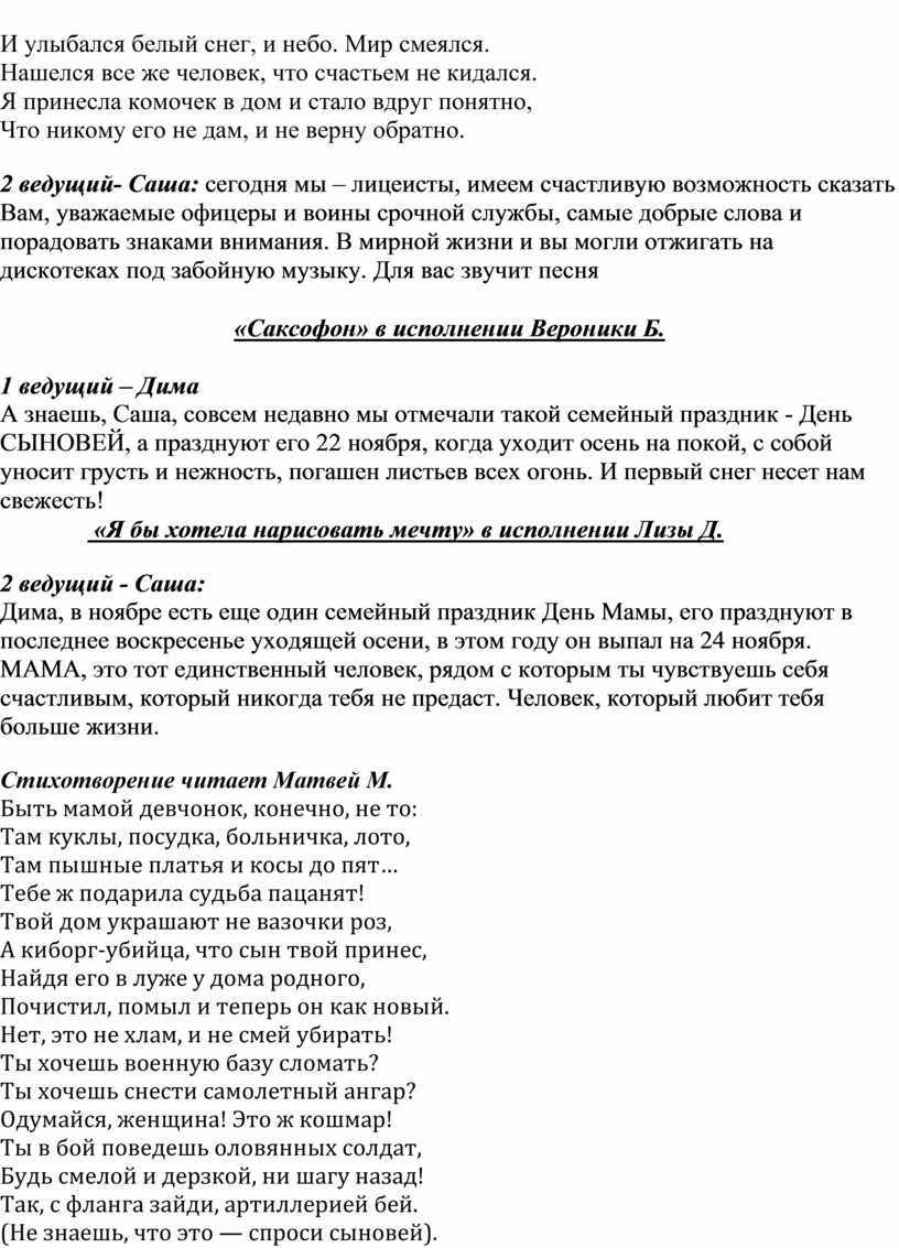 1 ведущий – Дима А знаешь, Саша, совсем недавно мы отмечали такой семейный праздник - День СЫНОВЕЙ, а празднуют его 22 ноября, когда уходит осень на покой, с собой уносит грусть и нежность, погашен листьев всех огонь. И первый снег несет нам свежесть!
