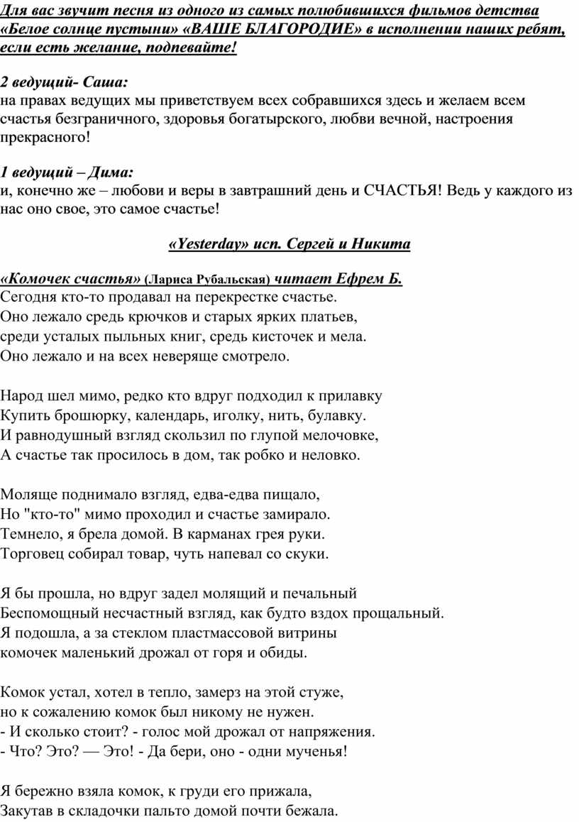 1 ведущий – Дима: и, конечно же – любови и веры в завтрашний день и СЧАСТЬЯ! Ведь у каждого из нас оно свое, это самое счастье!