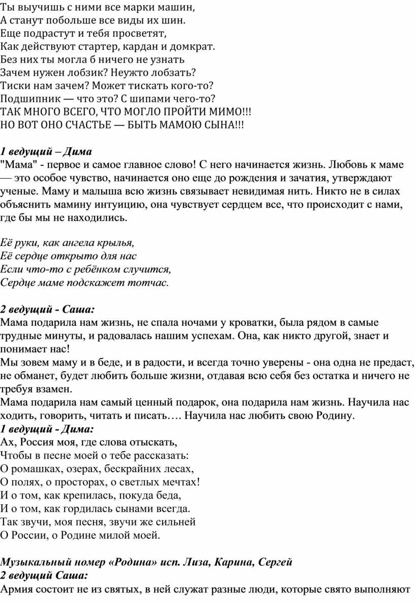 2 ведущий - Саша: Дима, в ноябре есть еще один семейный праздник День Мамы, его празднуют в последнее воскресенье уходящей осени, в этом году он выпал на 24 ноября. МАМА, это тот единственный человек, рядом с которым ты чувствуешь себя счастливым, который никогда тебя не предаст. Человек, который любит тебя больше жизни.