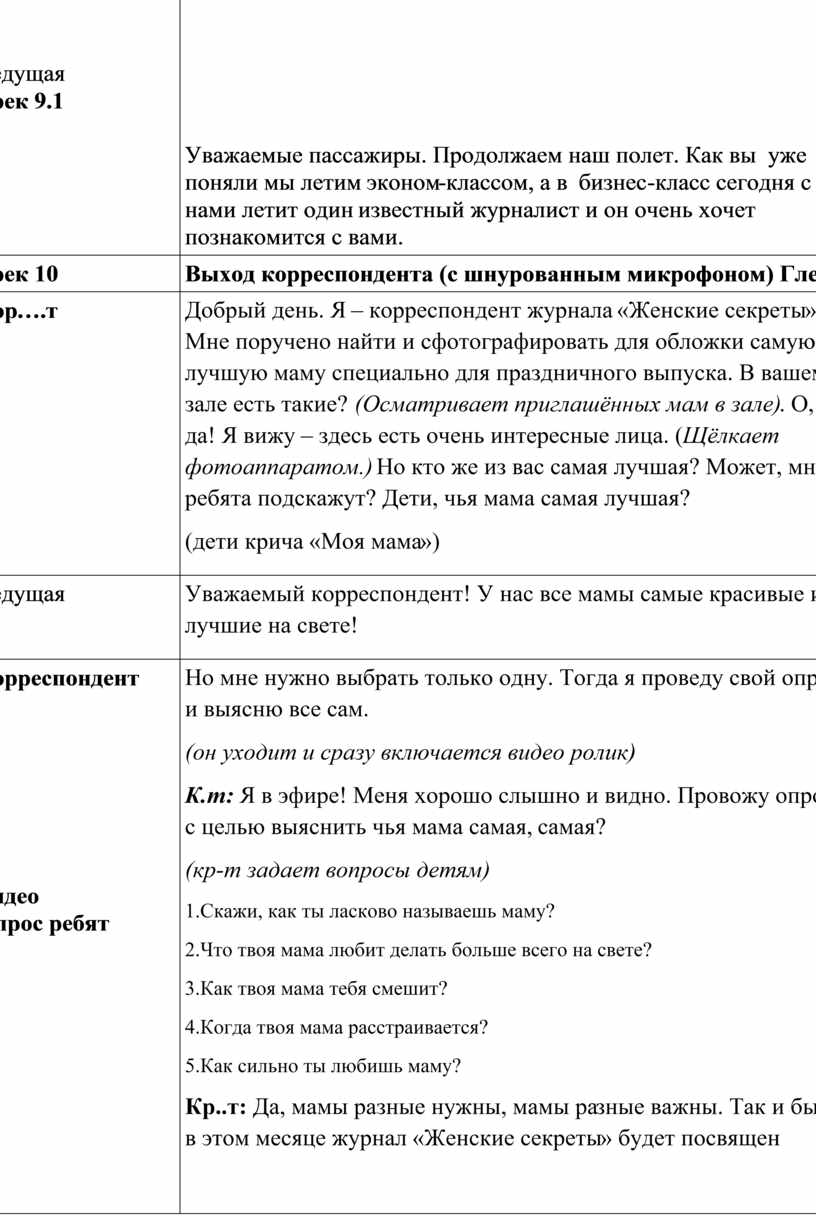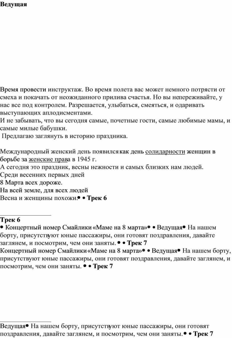 Время провести инструктаж. Во время полета вас может немного потрясти от смеха и покачать от неожиданного прилива счастья. Но вы не переживайте, у нас все под контролем. Разрешается, улыбаться, смеяться, и одаривать выступающих аплодисментами. И не забывать, что вы сегодня самые, почетные гости, самые любимые мамы, и самые милые бабушки. Предлагаю заглянуть в историю праздника.