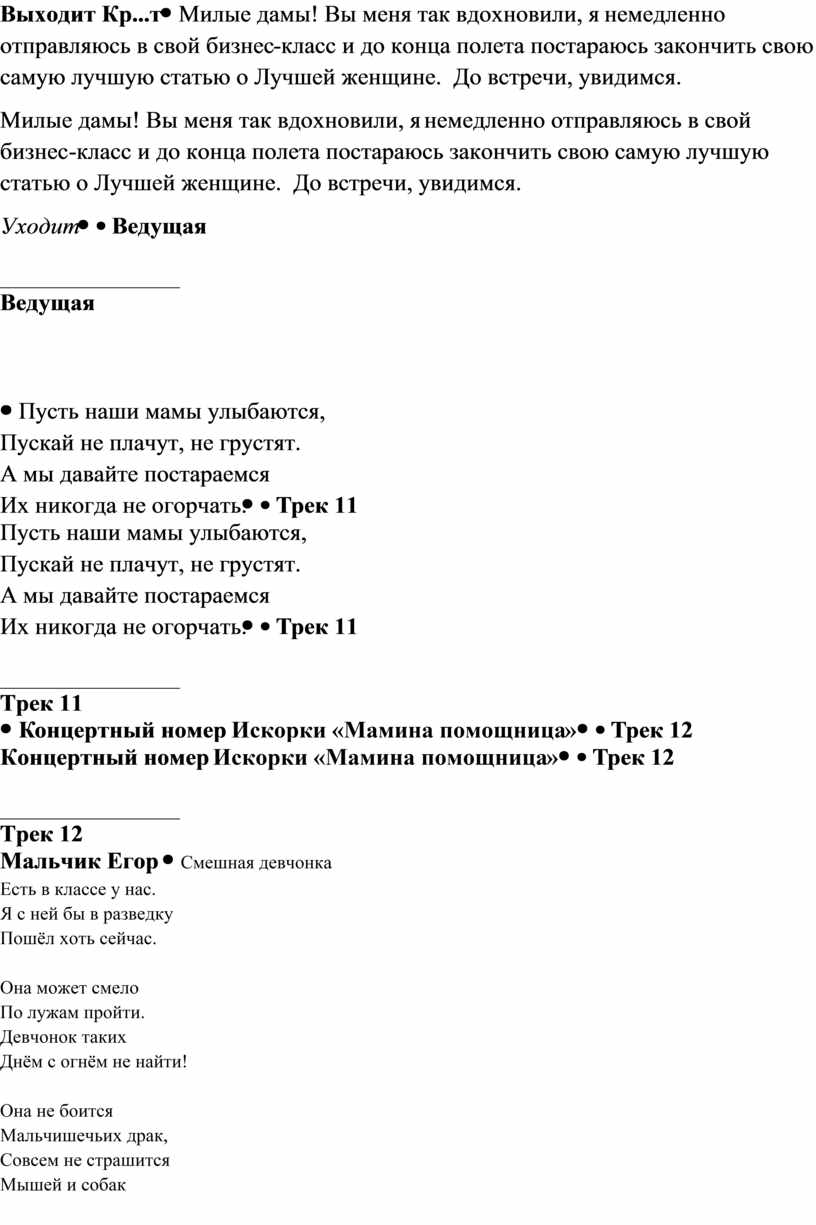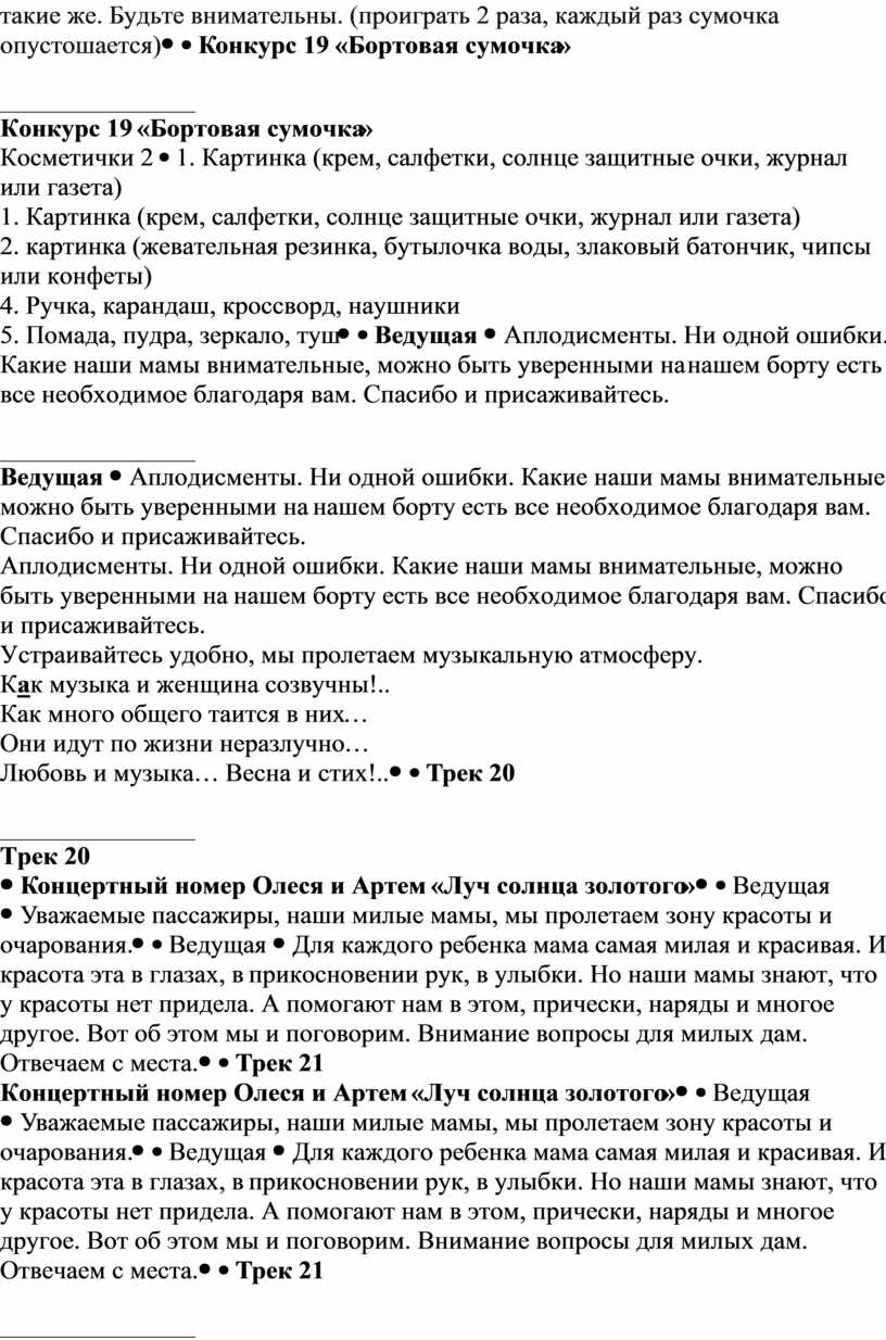 Аплодисменты. Ни одной ошибки. Какие наши мамы внимательные, можно быть уверенными на нашем борту есть все необходимое благодаря вам. Спасибо и присаживайтесь. Устраивайтесь удобно, мы пролетаем музыкальную атмосферу. Как музыка и женщина созвучны!.. Как много общего таится в них… Они идут по жизни неразлучно… Любовь и музыка… Весна и стих!.. |