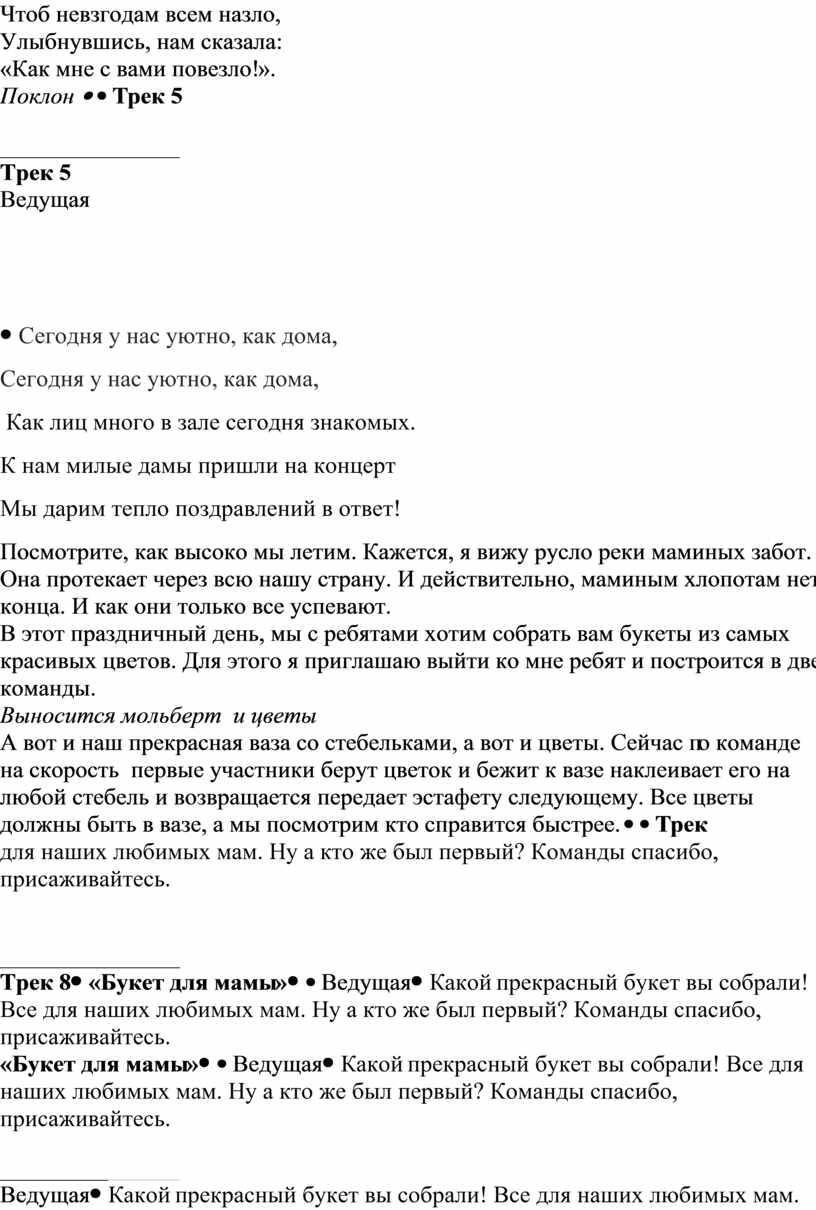 Сегодня у нас уютно, как дома, Как лиц много в зале сегодня знакомых. К нам милые дамы пришли на концерт Мы дарим тепло поздравлений в ответ! Посмотрите, как высоко мы летим. Кажется, я вижу русло реки маминых забот. Она протекает через всю нашу страну. И действительно, маминым хлопотам нет конца. И как они только все успевают. В этот праздничный день, мы с ребятами хотим собрать вам букеты из самых красивых цветов. Для этого я приглашаю выйти ко мне ребят и построится в две команды. Выносится мольберт и цветы А вот и наш прекрасная ваза со стебельками, а вот и цветы. Сейчас по команде на скорость первые участники берут цветок и бежит к вазе наклеивает его на любой стебель и возвращается передает эстафету следующему. Все цветы должны быть в вазе, а мы посмотрим кто справится быстрее. |