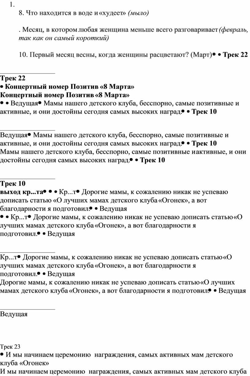 Но мне нужно выбрать только одну. Тогда я проведу свой опрос и выясню все сам. (он уходит и сразу включается видео ролик) К.т: Я в эфире! Меня хорошо слышно и видно. Провожу опрос с целью выяснить чья мама самая, самая? (кр-т задает вопросы детям) 1.Скажи, как ты ласково называешь маму? 2.Что твоя мама любит делать больше всего на свете? 3.Как твоя мама тебя смешит? 4.Когда твоя мама расстраивается? 5.Как сильно ты любишь маму? Кр..т: Да, мамы разные нужны, мамы разные важны. Так и быть в этом месяце журнал «Женские секреты» будет посвящен только мамам детского клуба «Огонек». Они этого достойны. Внимание на экран. (видео презентация дети д.к. Огонек с мамами) |