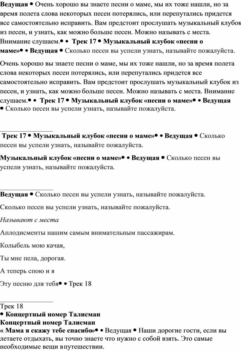 Очень хорошо вы знаете песни о маме, мы их тоже нашли, но за время полета слова некоторых песен потерялись, или перепутались придется все самостоятельно исправить. Вам предстоит прослушать музыкальный клубок из песен, и узнать, как можно больше песен. Можно называть с места. Внимание слушаем. |