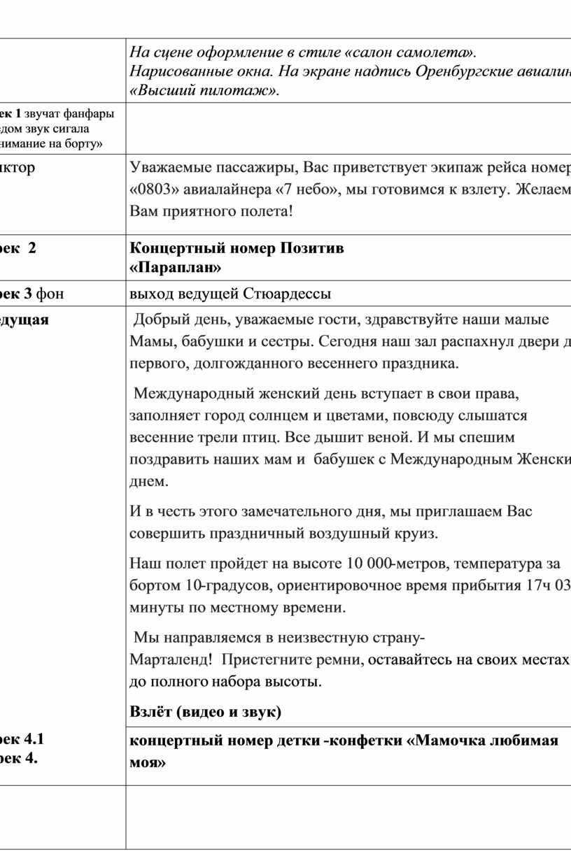 Добрый день, уважаемые гости, здравствуйте наши малые Мамы, бабушки и сестры. Сегодня наш зал распахнул двери для первого, долгожданного весеннего праздника. Международный женский день вступает в свои права, заполняет город солнцем и цветами, повсюду слышатся весенние трели птиц. Все дышит веной. И мы спешим поздравить наших мам и бабушек с Международным Женским днем. И в честь этого замечательного дня, мы приглашаем Вас совершить праздничный воздушный круиз. Наш полет пройдет на высоте 10 000-метров, температура за бортом 10-градусов, ориентировочное время прибытия 17ч 03 минуты по местному времени. Мы направляемся в неизвестную страну- Марталенд! Пристегните ремни, оставайтесь на своих местах до полного набора высоты. Взлёт (видео и звук) |