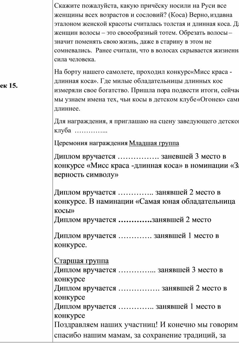 Скажите пожалуйста, какую причёску носили на Руси все женщины всех возрастов и сословий? (Коса) Верно, издавна эталоном женской красоты считалась толстая и длинная коса. Для женщин волосы – это своеобразный тотем. Обрезать волосы – значит поменять свою жизнь, даже в старину в этом не сомневались. Ранее считали, что в волосах скрывается жизненная сила человека. На борту нашего самолете, проходил конкурс «Мисс краса - длинная коса». Где милые обладательницы длинных кос измеряли свое богатство. Пришла пора подвести итоги, сейчас мы узнаем имена тех, чьи косы в детском клубе «Огонек» самые длиннее. Для награждения, я приглашаю на сцену заведующего детского клуба …………... Церемония награждения Младшая группа Диплом вручается ……………. заневшей 3 место в конкурсе «Мисс краса -длинная коса» в номинации «За верность символу»