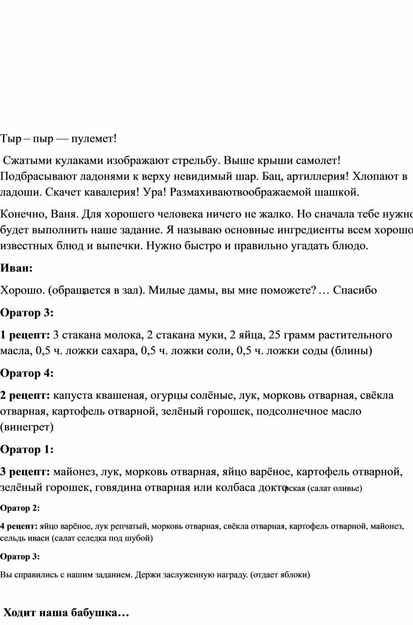 Конечно, Ваня. Для хорошего человека ничего не жалко. Но сначала тебе нужно будет выполнить наше задание. Я называю основные ингредиенты всем хорошо известных блюд и выпечки. Нужно быстро и правильно угадать блюдо.