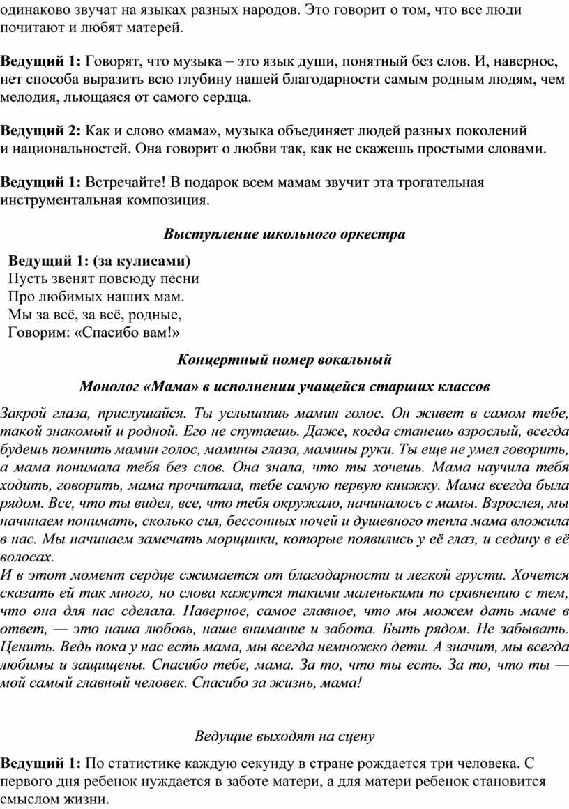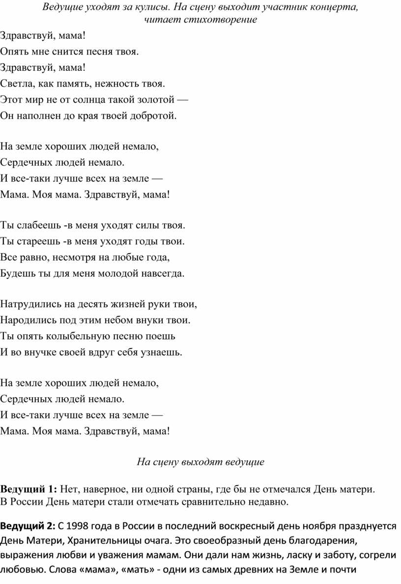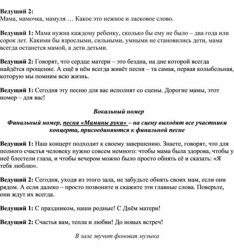 Ведущий 2: Сегодня, уходя из этого зала, не забудьте обнять своих мам, если они рядом. А если далеко – просто позвоните и скажите эти главные слова. Поверьте, они ждут их всегда.