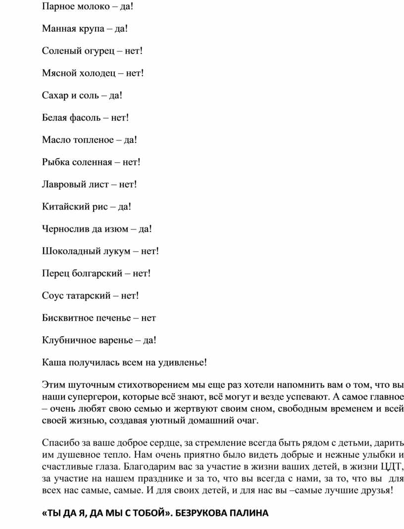 Этим шуточным стихотворением мы еще раз хотели напомнить вам о том, что вы наши супергерои, которые всё знают, всё могут и везде успевают. А самое главное – очень любят свою семью и жертвуют своим сном, свободным временем и всей своей жизнью, создавая уютный домашний очаг.