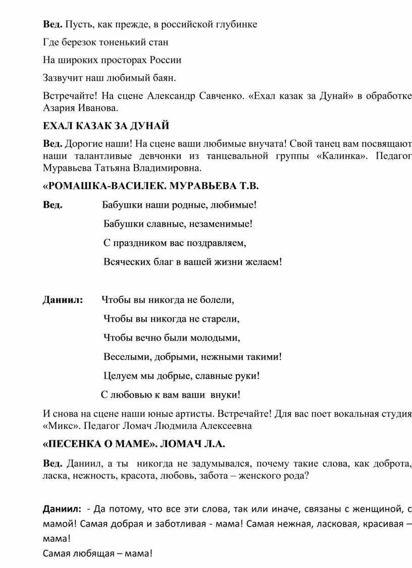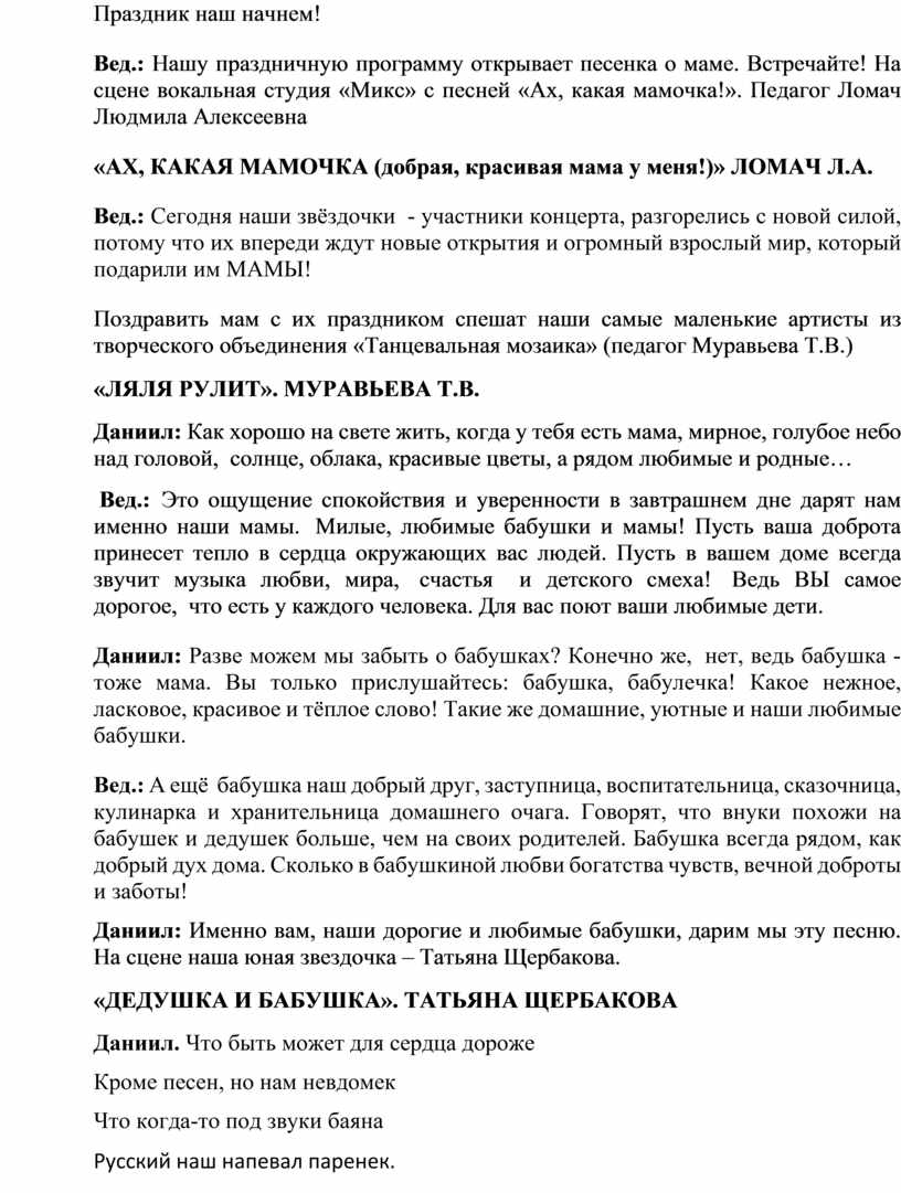 Вед.: Посвящаем мы нашу концертную программу «Лучшей маме на свете». И сегодня своим творчеством вас, дорогие мамочки, будут радовать ваши дочки и сыночки. Мы хотим, чтобы сейчас вы поддержали их дружными аплодисментами, ведь наши юные артисты очень волнуются за кулисами и ждут вашего признания! Аплодисменты