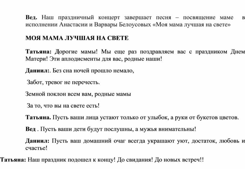 Вед. Наш праздничный концерт завершает песня – посвящение маме в исполнении Анастасии и Варвары Белоусовых «Моя мама лучшая на свете»