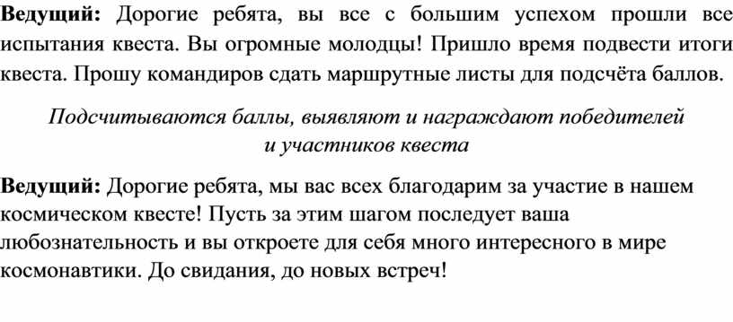 Ведущий: Дорогие ребята, вы все с большим успехом прошли все испытания квеста. Вы огромные молодцы! Пришло время подвести итоги квеста. Прошу командиров сдать маршрутные листы для подсчёта баллов.