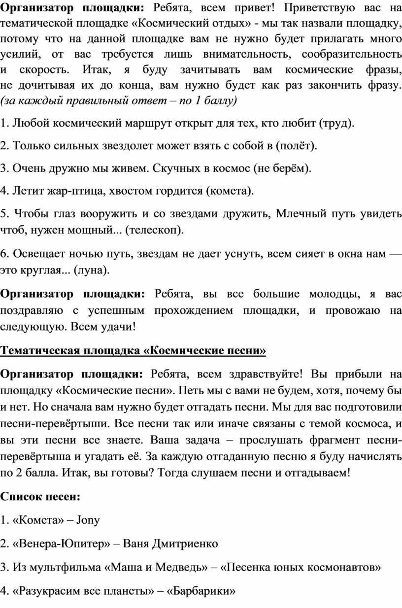 Организатор площадки: Ребята, всем здравствуйте! Вы прибыли на площадку «Космические песни». Петь мы с вами не будем, хотя, почему бы и нет. Но сначала вам нужно будет отгадать песни. Мы для вас подготовили песни-перевёртыши. Все песни так или иначе связаны с темой космоса, и вы эти песни все знаете. Ваша задача – прослушать фрагмент песни-перевёртыша и угадать её. За каждую отгаданную песню я буду начислять по 2 балла. Итак, вы готовы? Тогда слушаем песни и отгадываем!