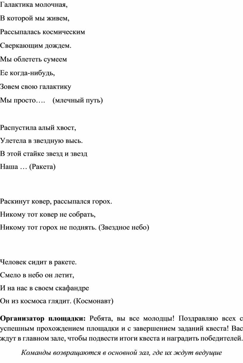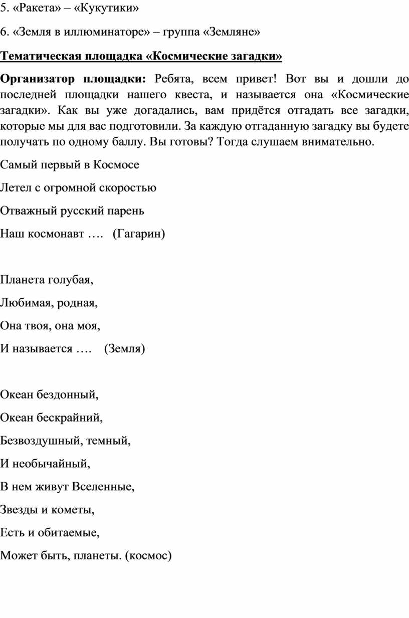 Организатор площадки: Ребята, всем привет! Вот вы и дошли до последней площадки нашего квеста, и называется она «Космические загадки». Как вы уже догадались, вам придётся отгадать все загадки, которые мы для вас подготовили. За каждую отгаданную загадку вы будете получать по одному баллу. Вы готовы? Тогда слушаем внимательно.