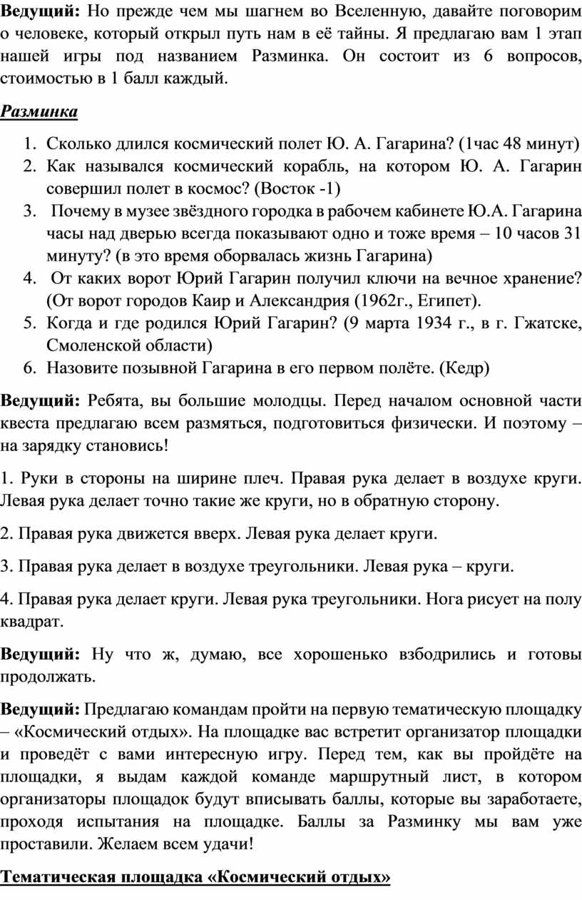 Ведущий: Предлагаю командам пройти на первую тематическую площадку – «Космический отдых». На площадке вас встретит организатор площадки и проведёт с вами интересную игру. Перед тем, как вы пройдёте на площадки, я выдам каждой команде маршрутный лист, в котором организаторы площадок будут вписывать баллы, которые вы заработаете, проходя испытания на площадке. Баллы за Разминку мы вам уже проставили. Желаем всем удачи!