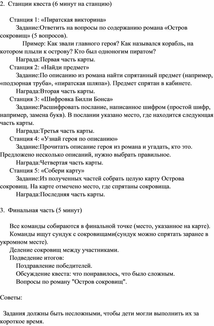 Сценарий квеста по роману «Остров сокровищ» Стивенсона, адаптированный для 5 класса, 30 учеников и 40 минут: