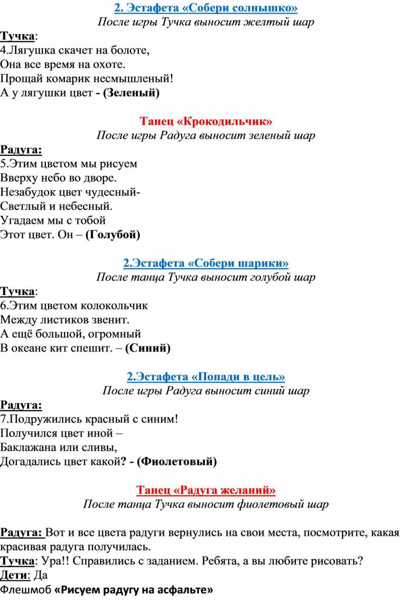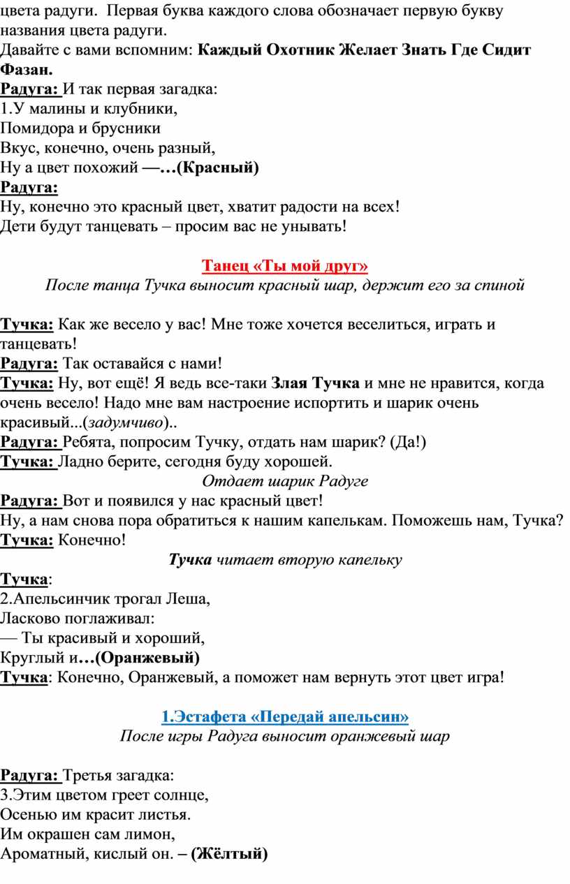 Ведущий: А чтобы их выполнить, нужно вспомнить цвета радуги. Люди придумали забавную считалку-говорилку, чтобы легче было запомнить все цвета радуги. Первая буква каждого слова обозначает первую букву названия цвета радуги.