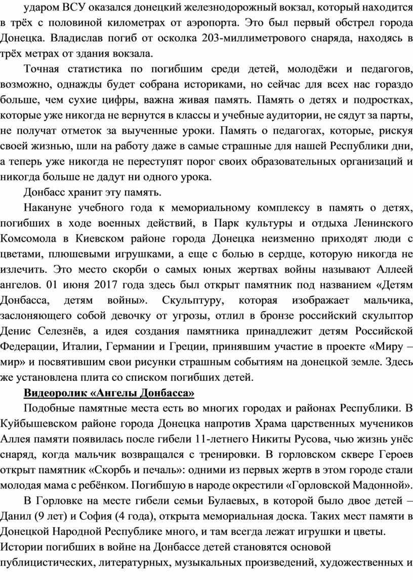 Гибель детей – это самая большая трагедия и несправедливость, которая может быть в мире. Каждый из погибших маленьких жителей Донбасса мог бы стать кем-то в этой жизни, реализовать свои мечты, сделать этот мир светлее. Кто-то из них хотел быть врачом и спасать жизни людей. Кто-то мечтал о профессии строителя, чтобы строить города. Кто-то мог вырасти и стать известным ученым. И все они были бы просто счастливыми людьми, мамами и папами, которые растили бы своих детей и жили, радуясь своим победам и достижениям. Но всё это оборвалось в один миг… украинскими боевиками.