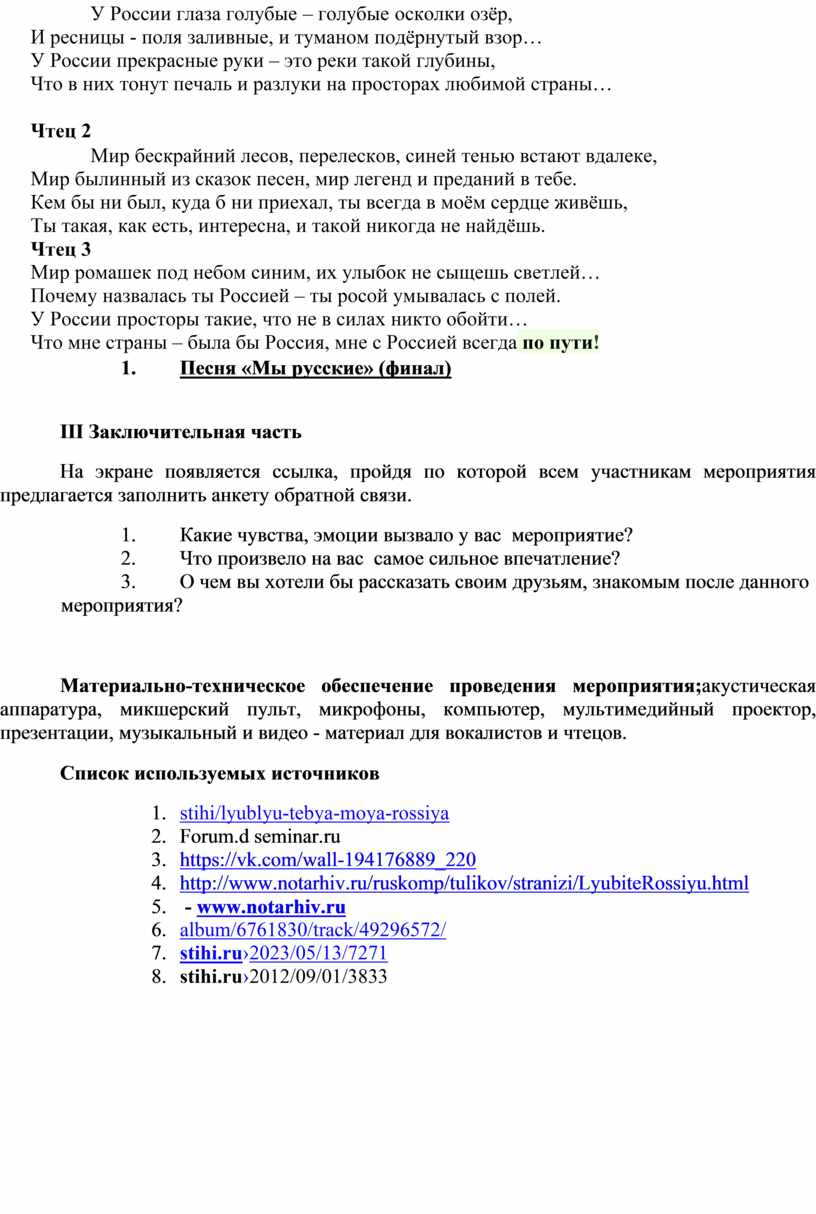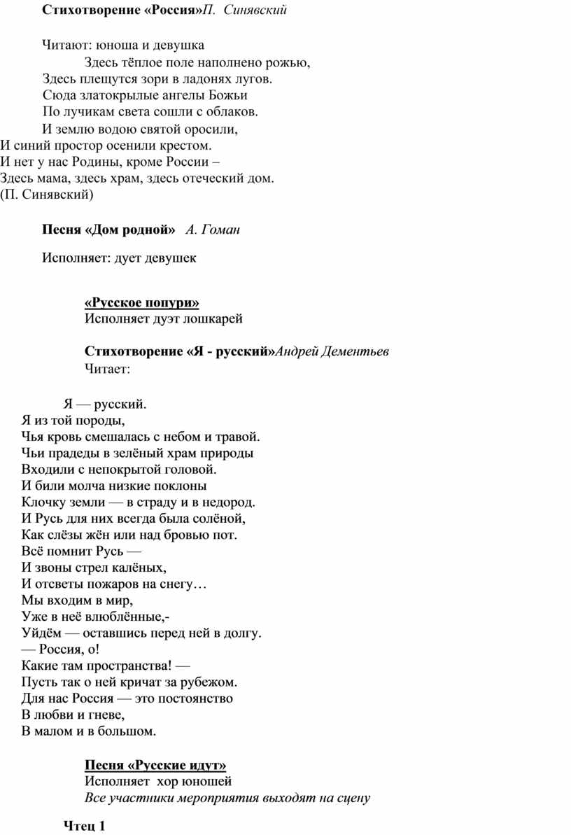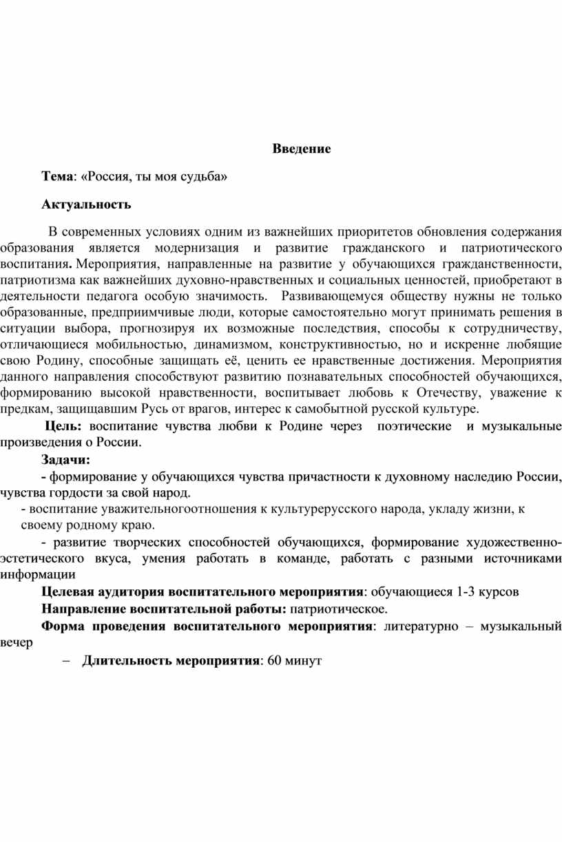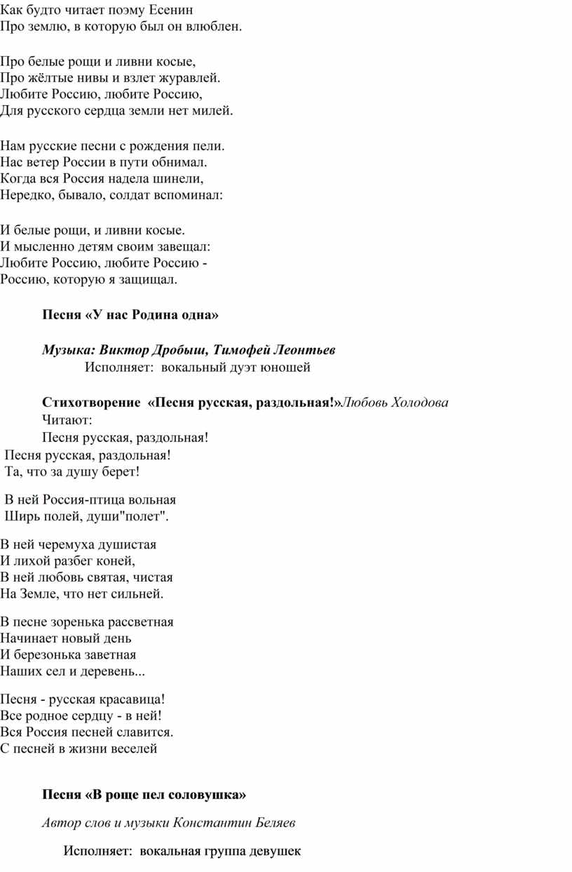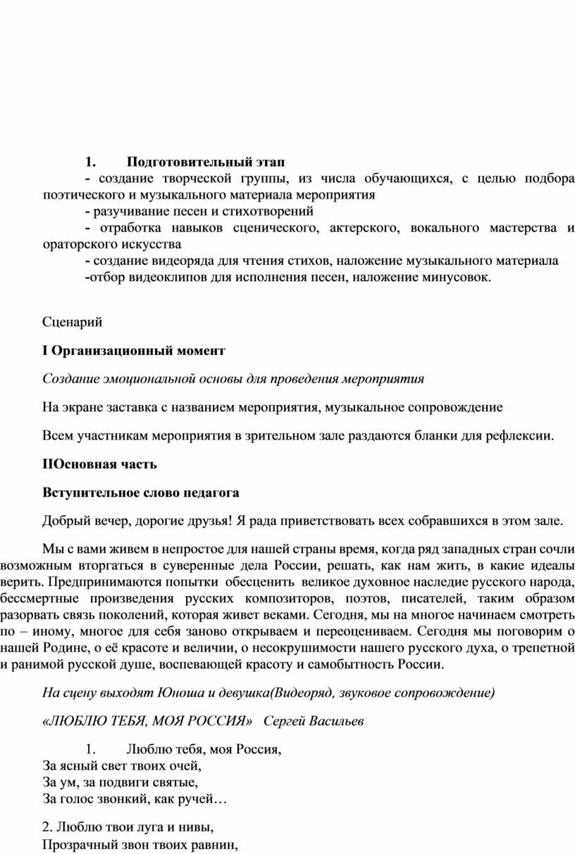 Мы с вами живем в непростое для нашей страны время, когда ряд западных стран сочли возможным вторгаться в суверенные дела России, решать, как нам жить, в какие идеалы верить. Предпринимаются попытки обесценить великое духовное наследие русского народа, бессмертные произведения русских композиторов, поэтов, писателей, таким образом разорвать связь поколений, которая живет веками. Сегодня, мы на многое начинаем смотреть по – иному, многое для себя заново открываем и переоцениваем. Сегодня мы поговорим о нашей Родине, о её красоте и величии, о несокрушимости нашего русского духа, о трепетной и ранимой русской душе, воспевающей красоту и самобытность России.
