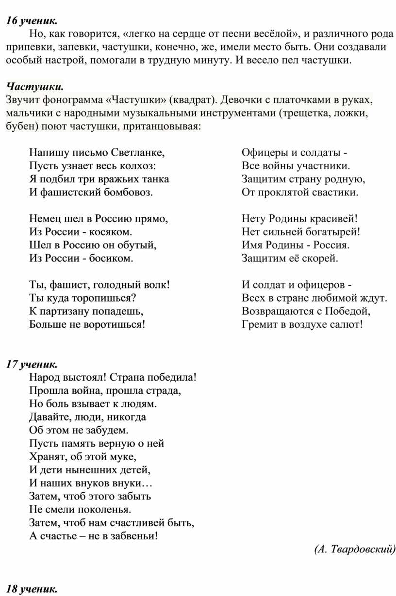 Но, как говорится, «легко на сердце от песни весёлой», и различного рода припевки, запевки, частушки, конечно, же, имели место быть. Они создавали особый настрой, помогали в трудную минуту. И весело пел частушки.