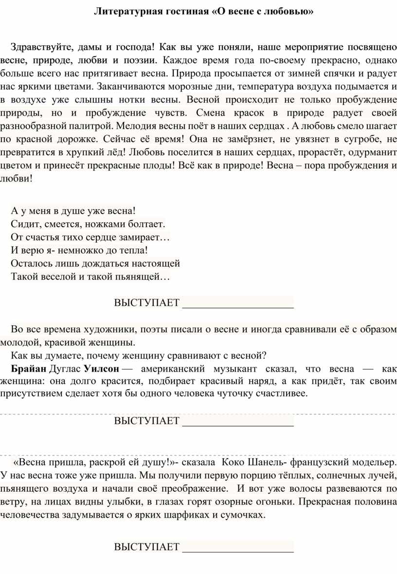 Здравствуйте, дамы и господа! Как вы уже поняли, наше мероприятие посвящено весне, природе, любви и поэзии. Каждое время года по-своему прекрасно, однако больше всего нас притягивает весна. Природа просыпается от зимней спячки и радует нас яркими цветами. Заканчиваются морозные дни, температура воздуха подымается и в воздухе уже слышны нотки весны. Весной происходит не только пробуждение природы, но и пробуждение чувств. Смена красок в природе радует своей разнообразной палитрой. Мелодия весны поёт в наших сердцах . А любовь смело шагает по красной дорожке. Сейчас её время! Она не замёрзнет, не увязнет в сугробе, не превратится в хрупкий лёд! Любовь поселится в наших сердцах, прорастёт, одурманит цветом и принесёт прекрасные плоды! Всё как в природе! Весна – пора пробуждения и любви!