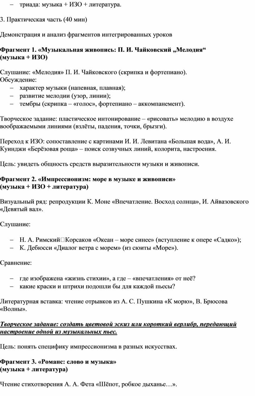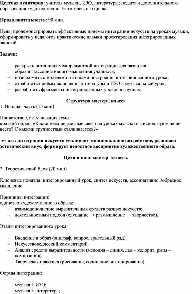Цель: продемонстрировать эффективные приёмы интеграции искусств на уроках музыки, сформировать у педагогов практические навыки проектирования интегрированных занятий.