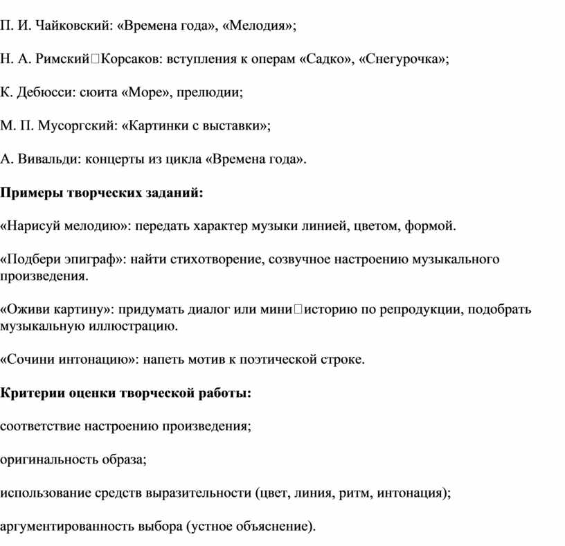 - Творческая практика (рисование, сочинение, интонирование).