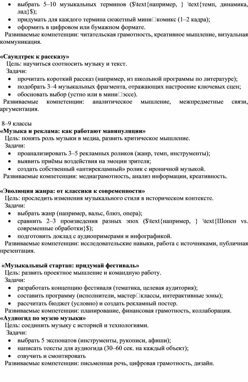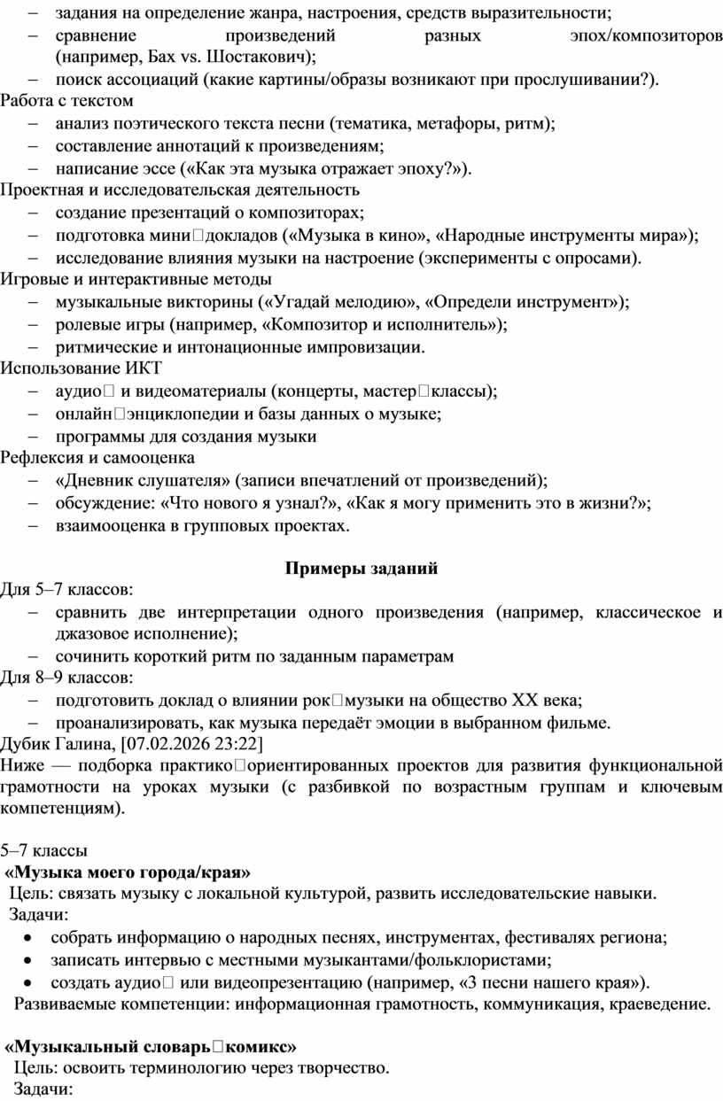 Ниже — подборка практико‑ориентированных проектов для развития функциональной грамотности на уроках музыки (с разбивкой по возрастным группам и ключевым компетенциям).