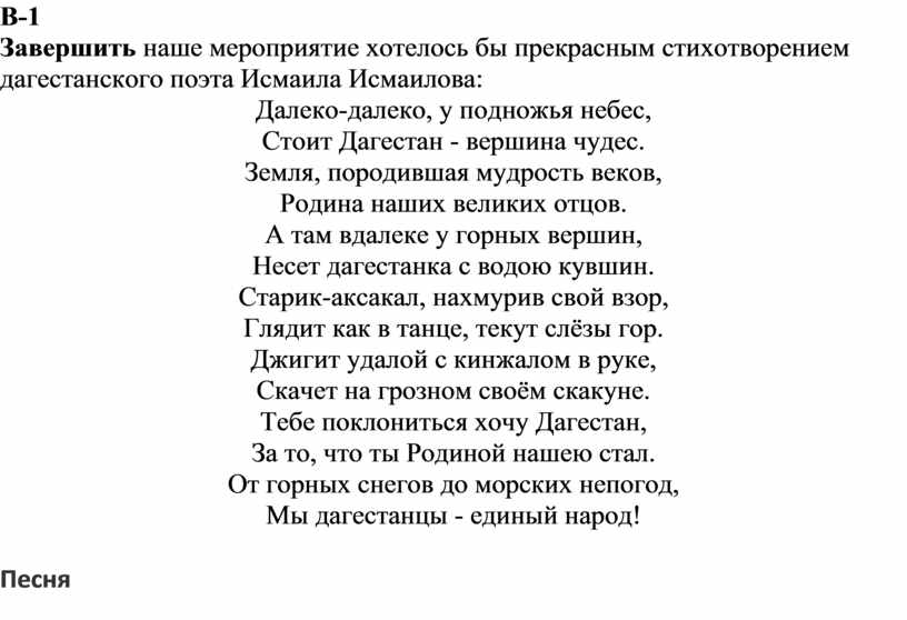 Завершить наше мероприятие хотелось бы прекрасным стихотворением дагестанского поэта Исмаила Исмаилова:
