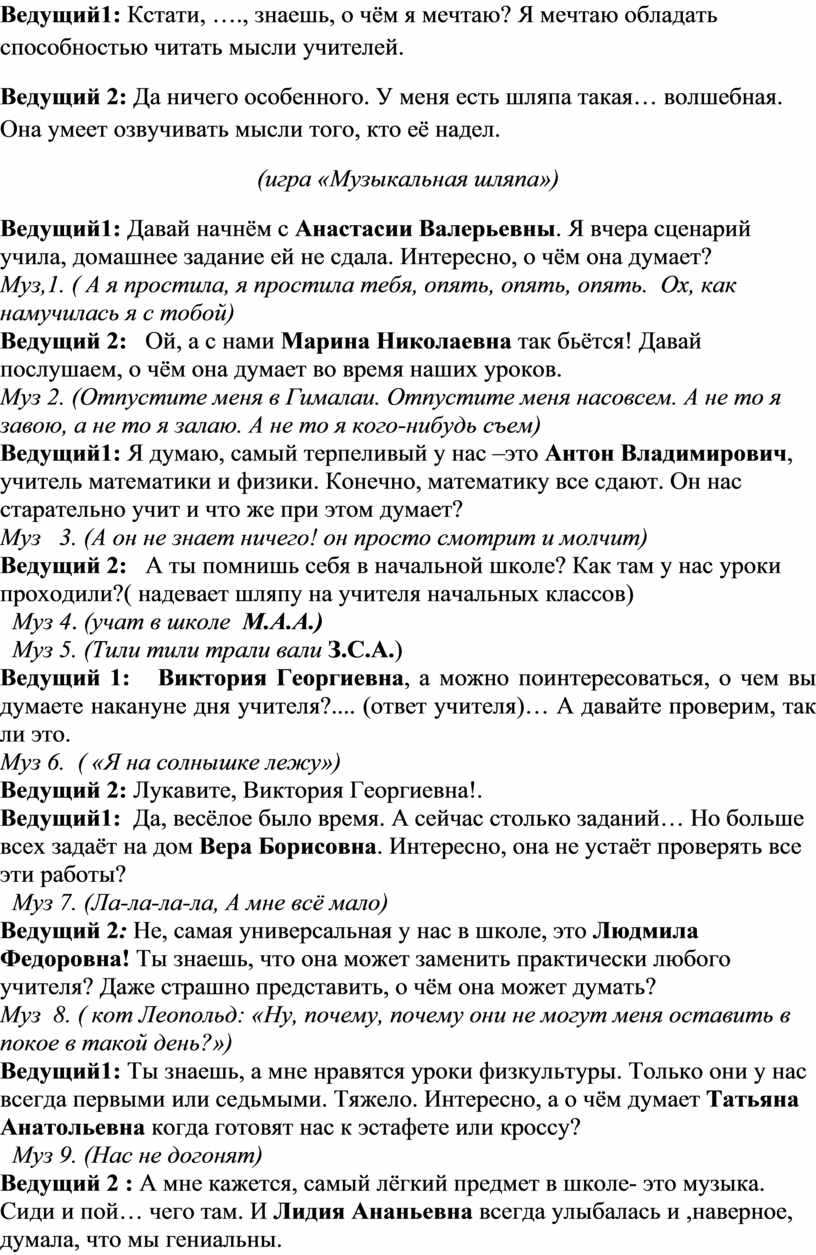 Ведущий1: Кстати, …., знаешь, о чём я мечтаю? Я мечтаю обладать способностью читать мысли учителей.
