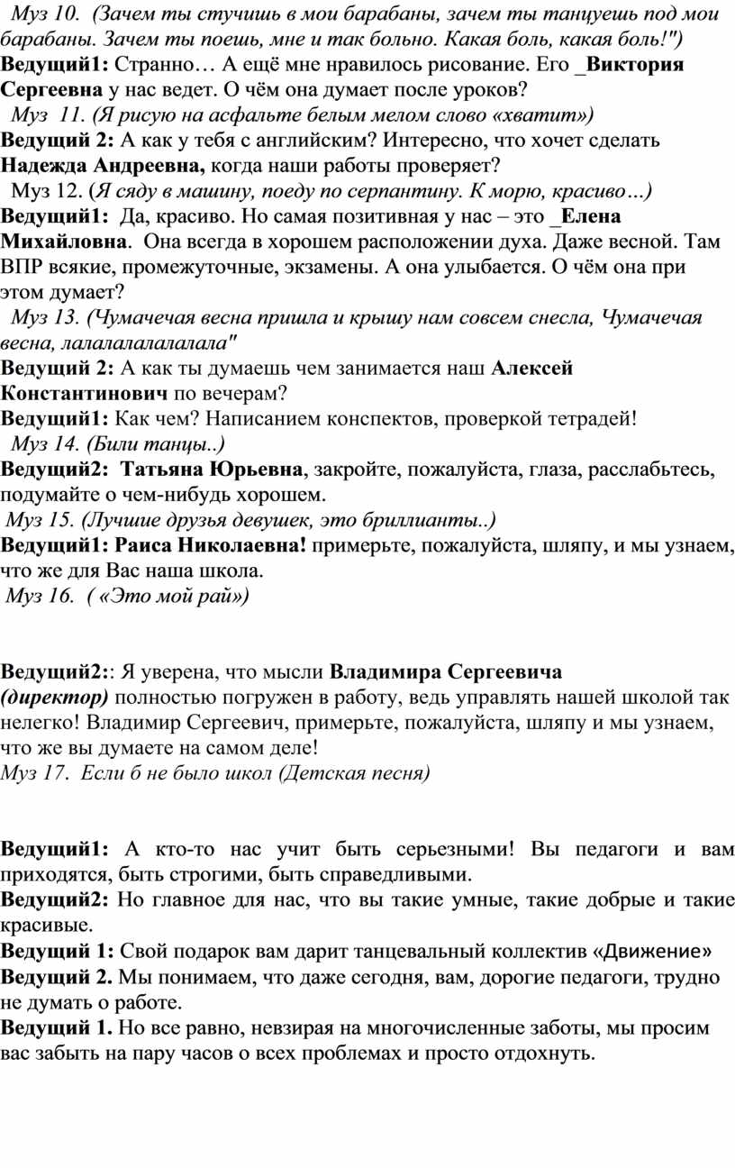 Ведущий 2 : Мы xoтим пoжeлaть вaм кpeпкoгo здopoвья, тepпeния, xopoшиx учeникoв. A caмoe глaвнoe – чтoбы вaшa paбoтa пpинocилa вaм тoлькo paдocть!