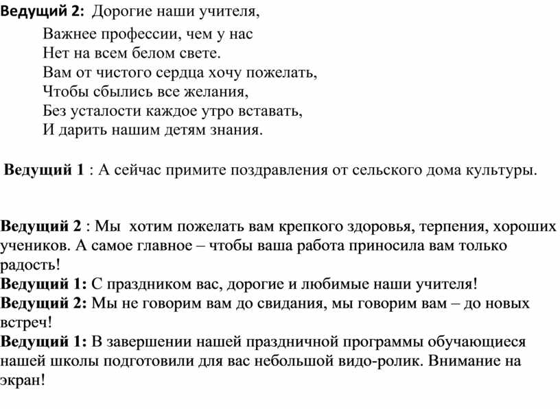 Ведущий 2. Поздравляем ветеранов этой замечательной профессии! Желаем вам в жизни только большого успеха и самого крепкого здоровья. Желаем вам никогда не забывать прекрасных моментов своей трудовой деятельности и всегда оставаться в сердцах ваших благодарных учеников.