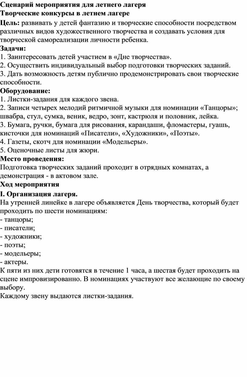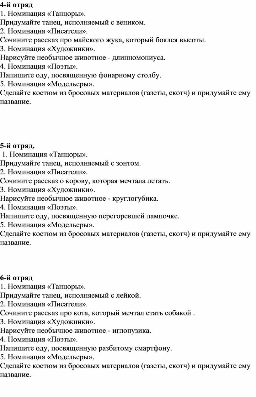 На утренней линейке в лагере объявляется День творчества, который будет проходить по шести номинациям: