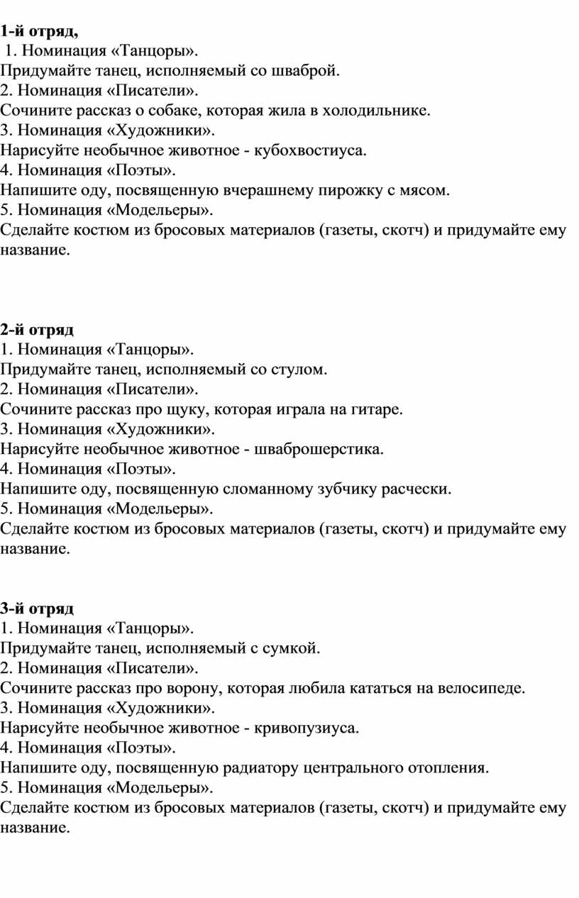 2. Записи четырех мелодий ритмичной музыки для номинации «Танцоры»; швабра, стул, сумка, веник, ведро, зонт, кастрюля и половник, лейка.