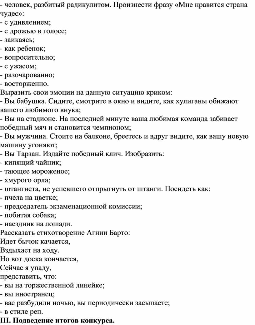 В шестой номинации «Актеры» участвуют все желающие дети. Ведущий предлагает выполнить следующие задания: Показать мимикой: