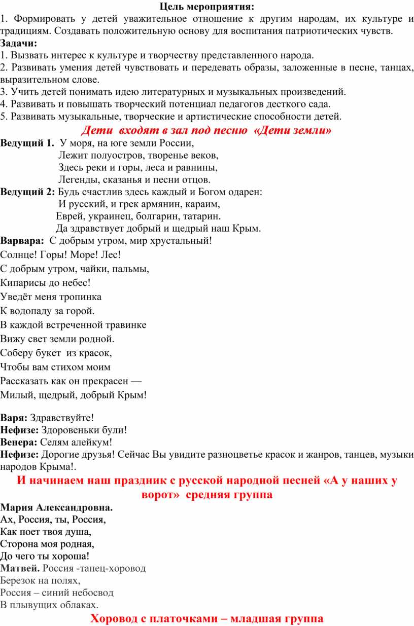 1. Формировать у детей уважительное отношение к другим народам, их культуре и традициям. Создавать положительную основу для воспитания патриотических чувств.