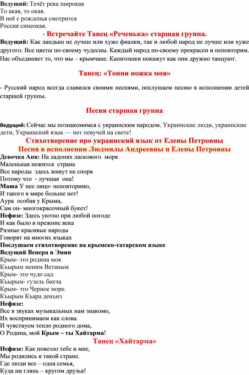 Ведущий: Как ландыш не лучше или хуже фиалки, так и любой народ не лучше или хуже другого. Все цветы по-своему чудесны. Каждый народ по-своему прекрасен и неповторим. Нас объединяет то, что мы – крымчане. Капитошки покажут как они дружно танцуют.