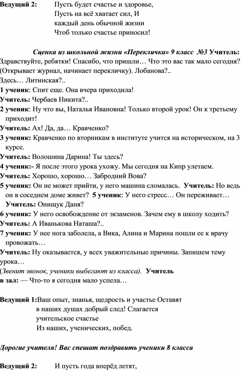 Сценка из школьной жизни «Перекличка» 9 класс №3 Учитель: Здравствуйте, ребятки! Спасибо, что пришли… Что это вас так мало сегодня? (Открывает журнал, начинает перекличку). Лобанова?..