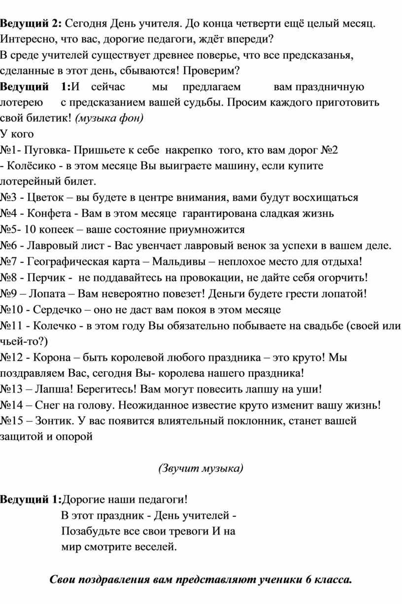 Ведущий 1:И сейчас мы предлагаем вам праздничную лотерею с предсказанием вашей судьбы. Просим каждого приготовить свой билетик! (музыка фон)