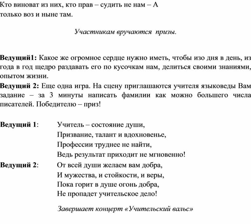 Ведущий 2: Еще одна игра. На сцену приглашаются учителя языковеды Вам задание – за 3 минуты написать фамилии как можно большего числа писателей. Победителю – приз!