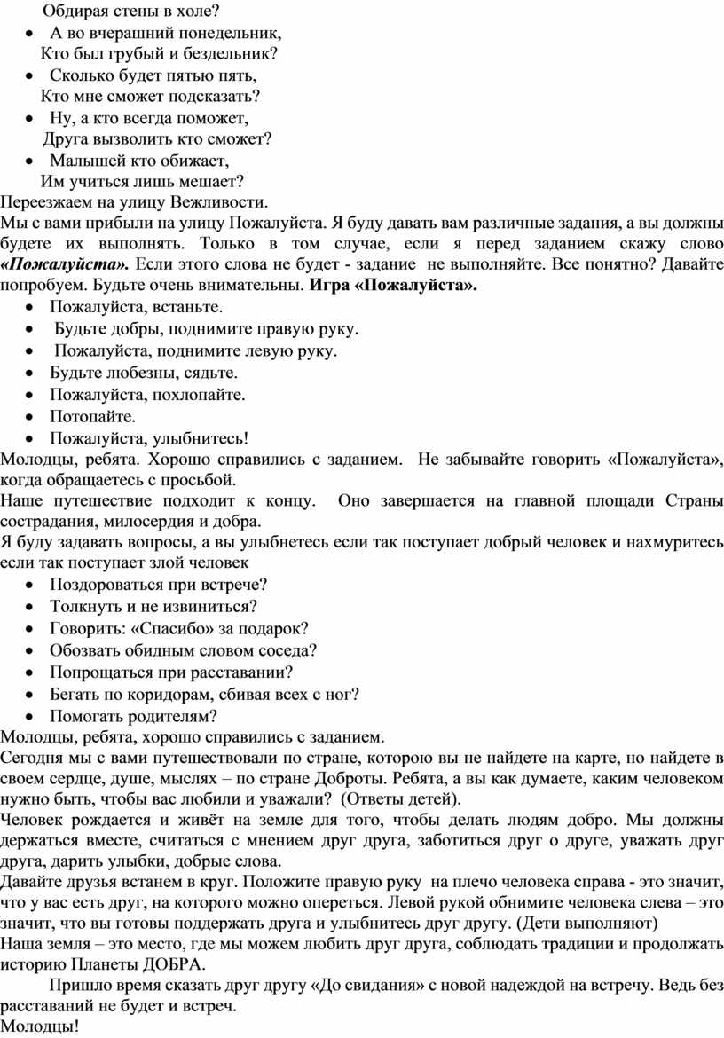 Сегодня мы с вами путешествовали по стране, которою вы не найдете на карте, но найдете в своем сердце, душе, мыслях – по стране Доброты. Ребята, а вы как думаете, каким человеком нужно быть, чтобы вас любили и уважали? (Ответы детей).
