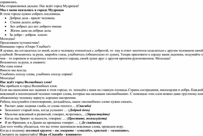 Если мы выполним все задания в этом городе, то попадём с вами на главную площадь Страны сострадания, милосердия и добра. Каждый вежливый и воспитанный человек говорит слова, которые мы называем «волшебными». С помощью этих слов можно даже грустному или обиженному человеку вернуть хорошее настроение.