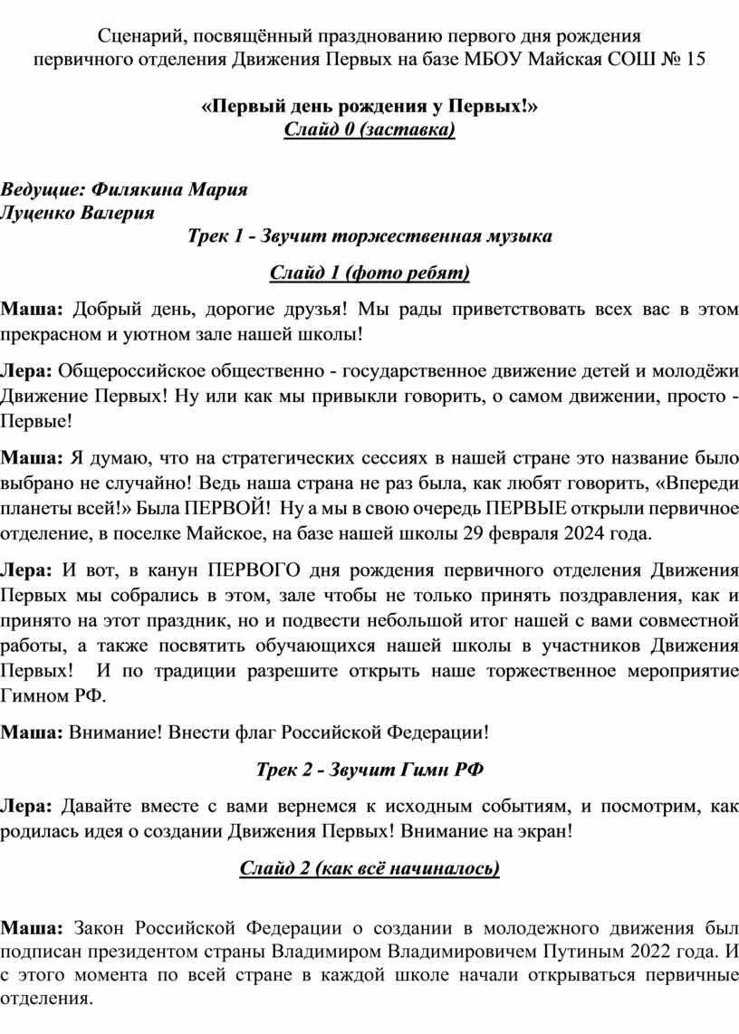Лера: И вот, в канун ПЕРВОГО дня рождения первичного отделения Движения Первых мы собрались в этом, зале чтобы не только принять поздравления, как и принято на этот праздник, но и подвести небольшой итог нашей с вами совместной работы, а также посвятить обучающихся нашей школы в участников Движения Первых! И по традиции разрешите открыть наше торжественное мероприятие Гимном РФ.