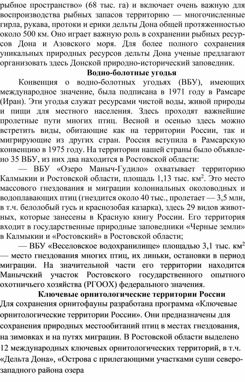 Конвенция о водно-болотных угодьях (ВБУ), имеющих международное значение, была подписана в 1971 году в Рамсаре (Иран). Эти угодья служат ресурсами чистой воды, живой природы и пищи для местного населения. Здесь проходят важнейшие пролетные пути многих птиц. Весной и осенью здесь можно встретить виды, обитающие как на территории России, так и мигрирующие из других стран. Россия вступила в Рамсарскую конвенцию в 1975 году. На территории нашей страны было объявлено 35 ВБУ, из них два находится в Ростовской области: