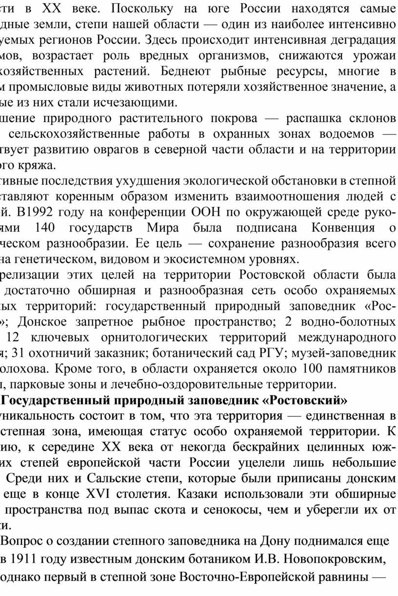 Но наибольшие изменения произошли в природе Ростовской области в XX веке. Поскольку на юге России находятся самые плодородные земли, степи нашей области — один из наиболее интенсивно используемых регионов России. Здесь происходит интенсивная деградация черноземов, возрастает роль вредных организмов, снижаются урожаи сельскохозяйственных растений. Беднеют рыбные ресурсы, многие в прошлом промысловые виды животных потеряли хозяйственное значение, а некоторые из них стали исчезающими.