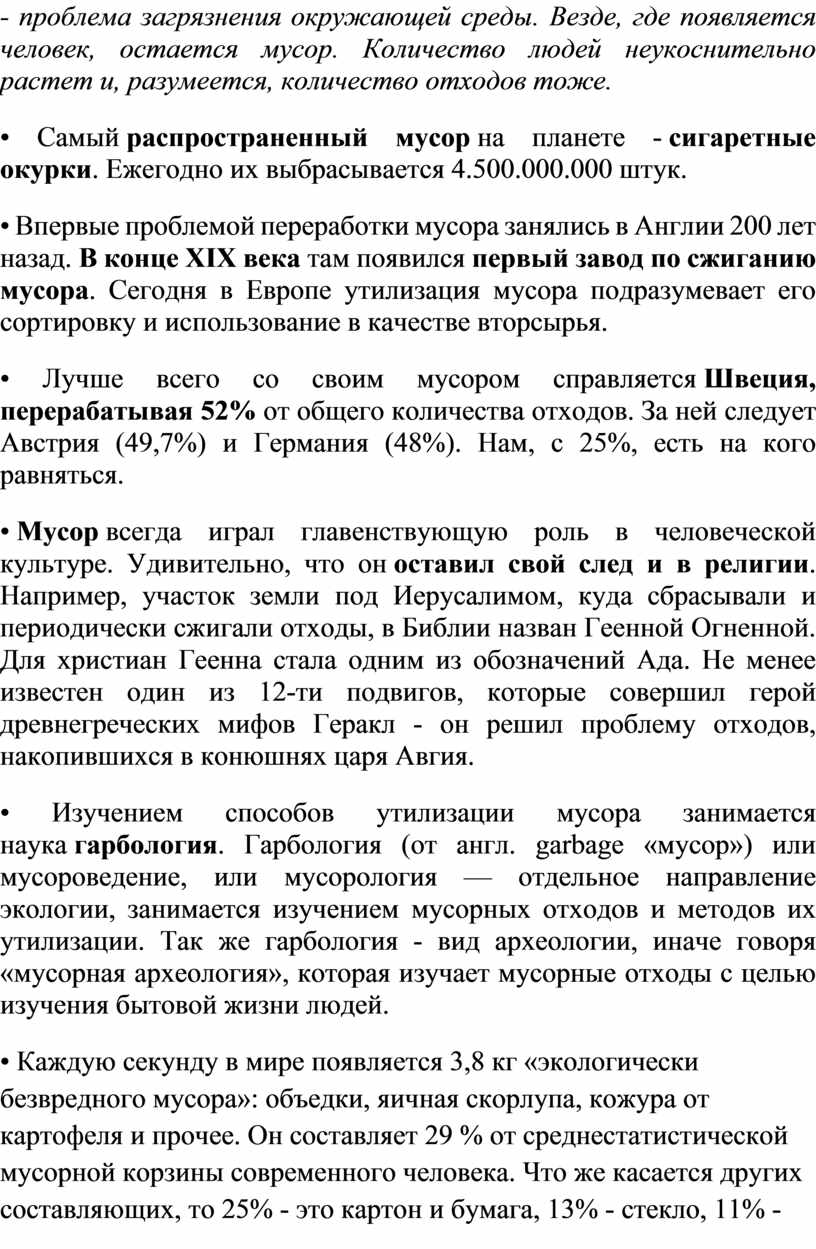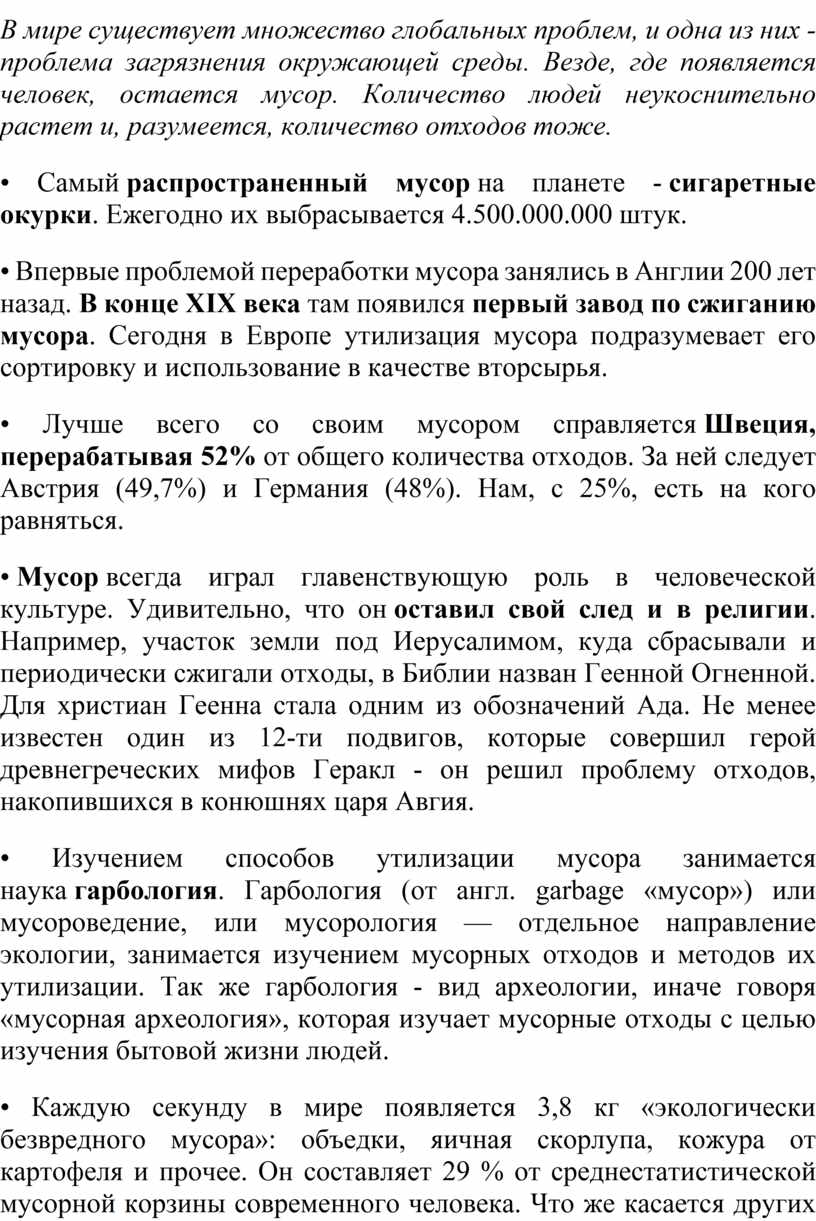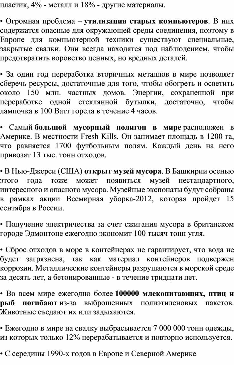 В мире существует множество глобальных проблем, и одна из них - проблема загрязнения окружающей среды. Везде, где появляется человек, остается мусор. Количество людей неукоснительно растет и, разумеется, количество отходов тоже. • Самый распространенный мусор на планете - сигаретные окурки. Ежегодно их выбрасывается 4.500.000.000 штук. • Впервые проблемой переработки мусора занялись в Англии 200 лет назад. В конце XIX века там появился первый завод по сжиганию мусора. Сегодня в Европе утилизация мусора подразумевает его сортировку и использование в качестве вторсырья. • Лучше всего со своим мусором справляется Швеция, перерабатывая 52% от общего количества отходов. За ней следует Австрия (49,7%) и Германия (48%). Нам, с 25%, есть на кого равняться. • Мусор всегда играл главенствующую роль в человеческой культуре. Удивительно, что он оставил свой след и в религии. Например, участок земли под Иерусалимом, куда сбрасывали и периодически сжигали отходы, в Библии назван Геенной Огненной. Для христиан Геенна стала одним из обозначений Ада. Не менее известен один из 12-ти подвигов, которые совершил герой древнегреческих мифов Геракл - он решил проблему отходов, накопившихся в конюшнях царя Авгия. • Изучением способов утилизации мусора занимается наука гарбология. Гарбология (от англ. garbage «мусор») или мусороведение, или мусорология — отдельное направление экологии, занимается изучением мусорных отходов и методов их утилизации. Так же гарбология - вид археологии, иначе говоря «мусорная археология», которая изучает мусорные отходы с целью изучения бытовой жизни людей. • Каждую секунду в мире появляется 3,8 кг «экологически безвредного мусора»: объедки, яичная скорлупа, кожура от картофеля и прочее. Он составляет 29 % от среднестатистической мусорной корзины современного человека. Что же касается других составляющих, то 25% - это картон и бумага, 13% - стекло, 11% - пластик, 4% - металл и 18% - другие материалы. • Огромная проблема – утилизация старых компьютеров. В них содержатся опасные для окружающей среды соединения, поэтому в Европе для компьютерной техники существуют специальные, закрытые свалки. Они всегда находятся под наблюдением, чтобы предотвратить воровство ценных, но вредных деталей. • За один год переработка вторичных металлов в мире позволяет сберечь ресурсы, достаточные для того, чтобы обогреть и осветить около 150 млн. частных домов. Энергии, сохраненной при переработке одной стеклянной бутылки, достаточно, чтобы лампочка в 100 Ватт горела в течение 4 часов. • Самый большой мусорный полигон в мире расположен в Америке. В местности Fresh Kills. Он занимает площадь в 1200 га, что равняется 1700 футбольным полям. Каждый день на него привозят 13 тыс. тонн отходов. • В Нью-Джерси (США) открыт музей мусора. В Башкирии осенью этого года тоже может появиться музей нестандартного, интересного и опасного мусора. Музейные экспонаты будут собраны в рамках акции Всемирная уборка-2012, которая пройдет 15 сентября в России. • Получение электричества за счет сжигания мусора в британском городе Эдмонтоне ежегодно экономит 100 тысяч тонн угля. • Сброс отходов в море в контейнерах не гарантирует, что вода не будет загрязнена, так как материал контейнеров подвержен коррозии. Металлические контейнеры разрушаются в морской среде за десять лет, а бетонированные - в течение тридцати л