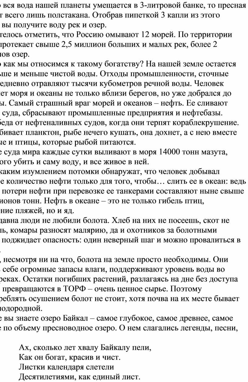Наша планета Земля – планета воды: более 3\4 занимают воды океанов, морей, озер, льдов. Но это соленая вода. Если представить, что вся вода нашей планеты умещается в 3-литровой банке, то пресная занимает всего лишь полстакана. Отобрав пипеткой 3 капли из этого стакана, вы получите воду рек и озер.