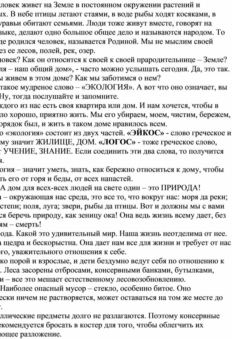 Человек живет на Земле в постоянном окружении растений и животных. В небе птицы летают стаями, в воде рыбы ходят косяками, в земле муравьи обитают семьями. Люди тоже живут вместе, говорят на одном языке, делают одно большое общее дело и называются народом. То место, где родился человек, называется Родиной. Мы не мыслим своей жизни без ее лесов, полей, рек, озер.