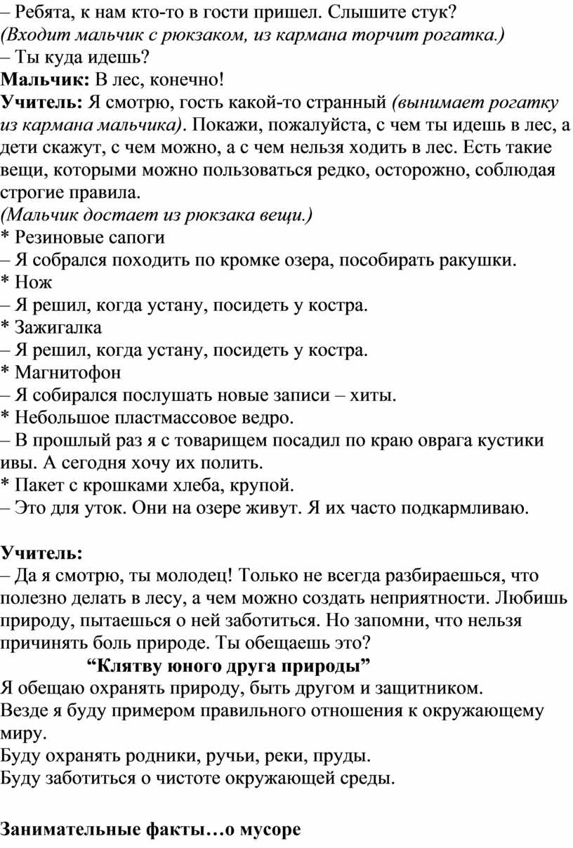 Учитель: Я смотрю, гость какой-то странный (вынимает рогатку из кармана мальчика). Покажи, пожалуйста, с чем ты идешь в лес, а дети скажут, с чем можно, а с чем нельзя ходить в лес. Есть такие вещи, которыми можно пользоваться редко, осторожно, соблюдая строгие правила.